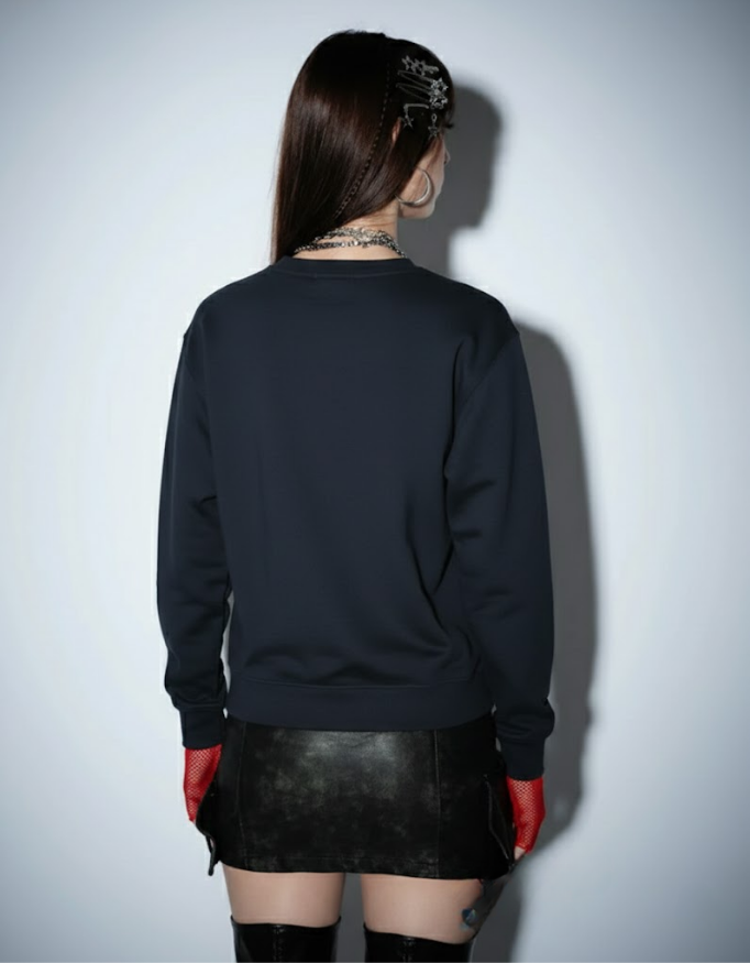 Lean into the monochromatic, dark-wear aesthetic. Pair this crewneck with slim-fit black denim or cargo trousers.